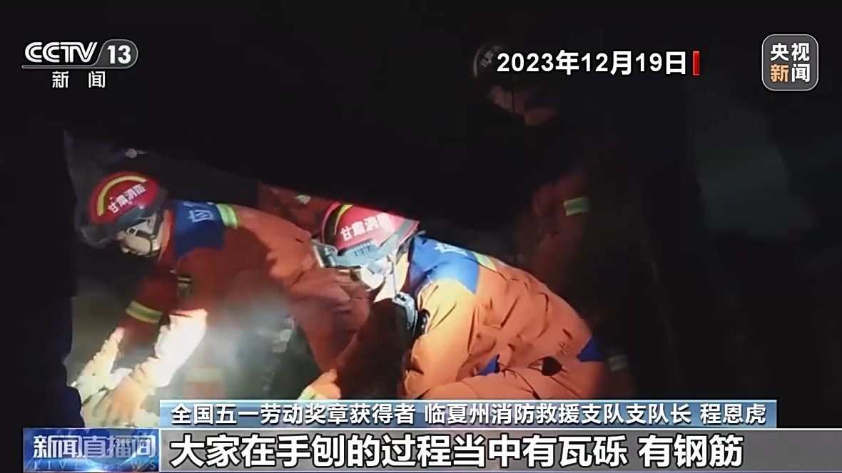 全國(guó)五一勞動(dòng)獎(jiǎng)?wù)芦@得者 臨夏州消防救援支隊(duì)支隊(duì)長(zhǎng) 程恩虎:所有隊(duì)員用徒手刨的這種方式,大家在手刨的過(guò)程當(dāng)中有瓦礫,有鋼筋,有鋒利的殘片。雖然咱們救援隊(duì)員戴著手套,但是不同程度地對(duì)咱們隊(duì)員的皮膚進(jìn)行了劃傷。