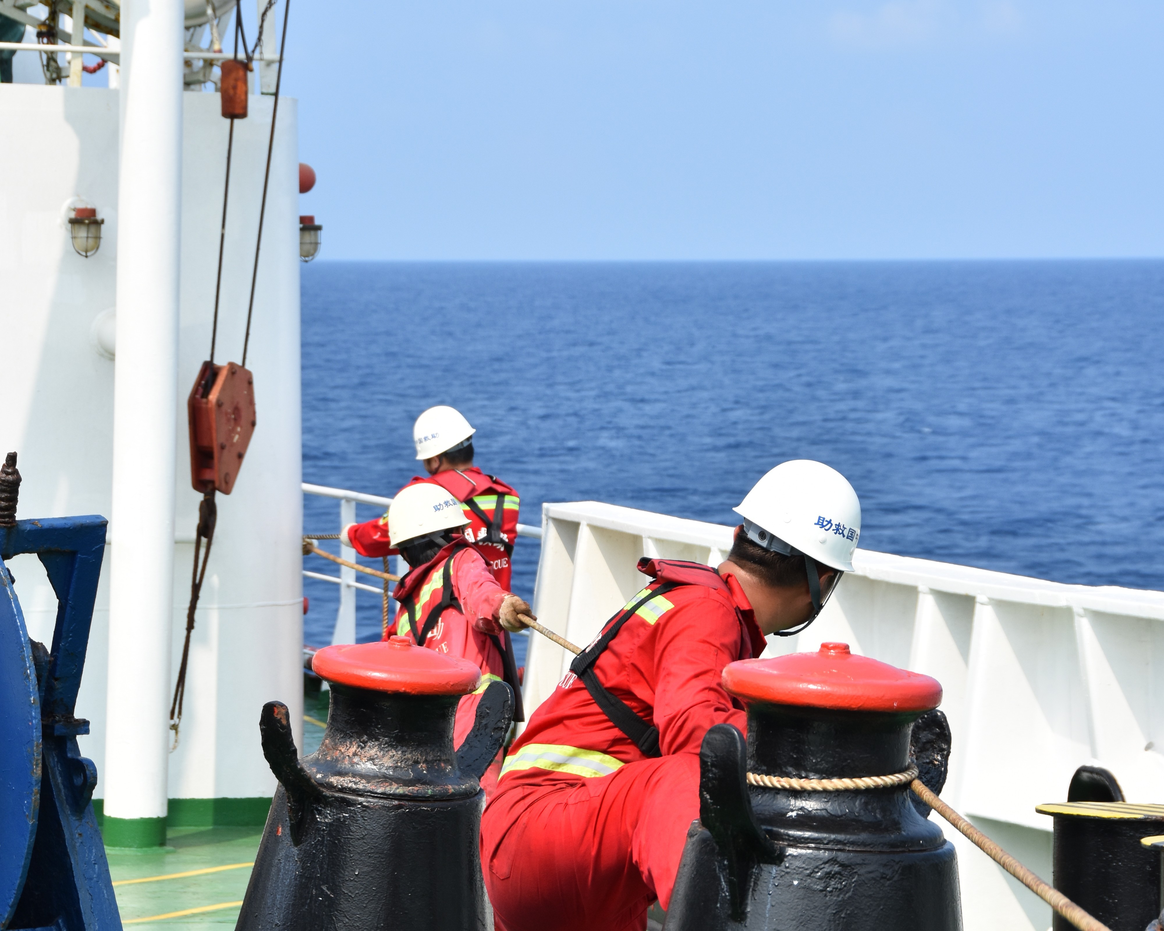 2023年3月4日,“南海救115”輪在南沙海域拖航救援外籍貨輪,盧大明(右一)正在甲板拆卸拖纜夾調(diào)整纜繩。(受訪者供圖)