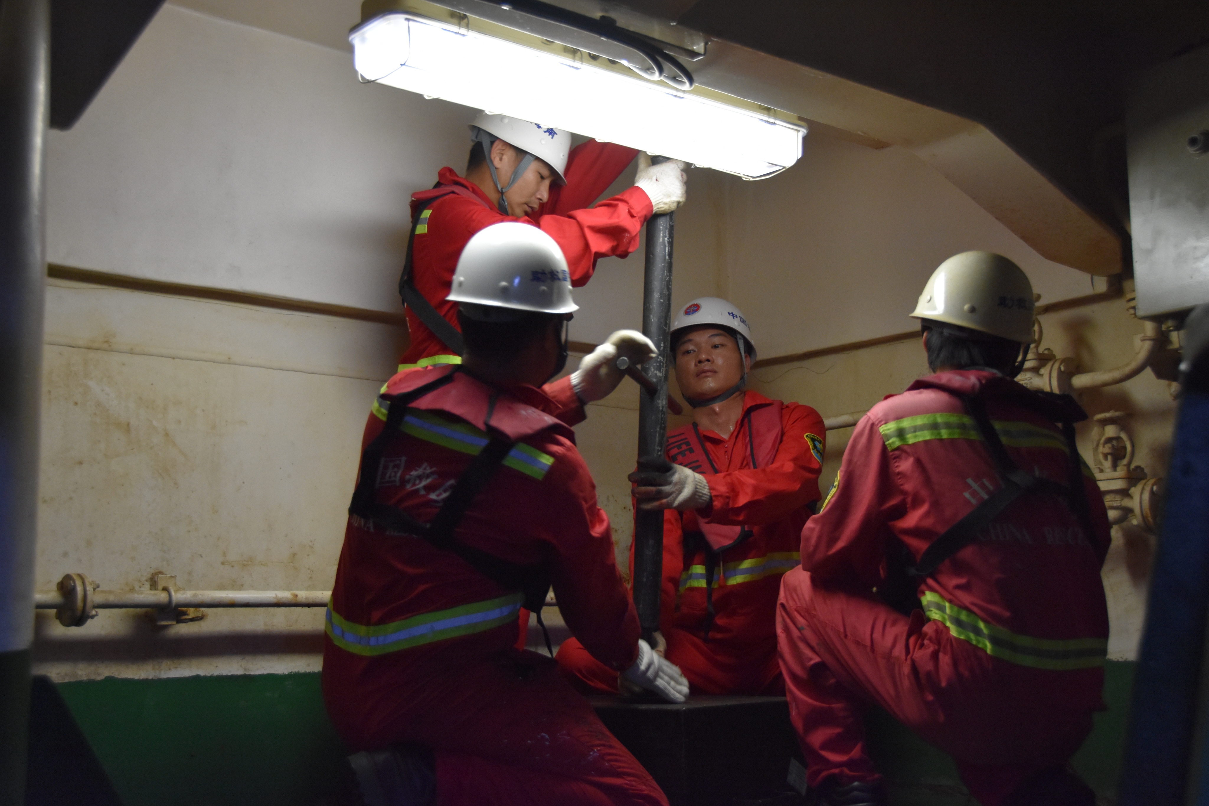 4月10日,“南海救115”輪船員正在舵機房進行堵漏應(yīng)急演練。新華社記者 夏天 攝