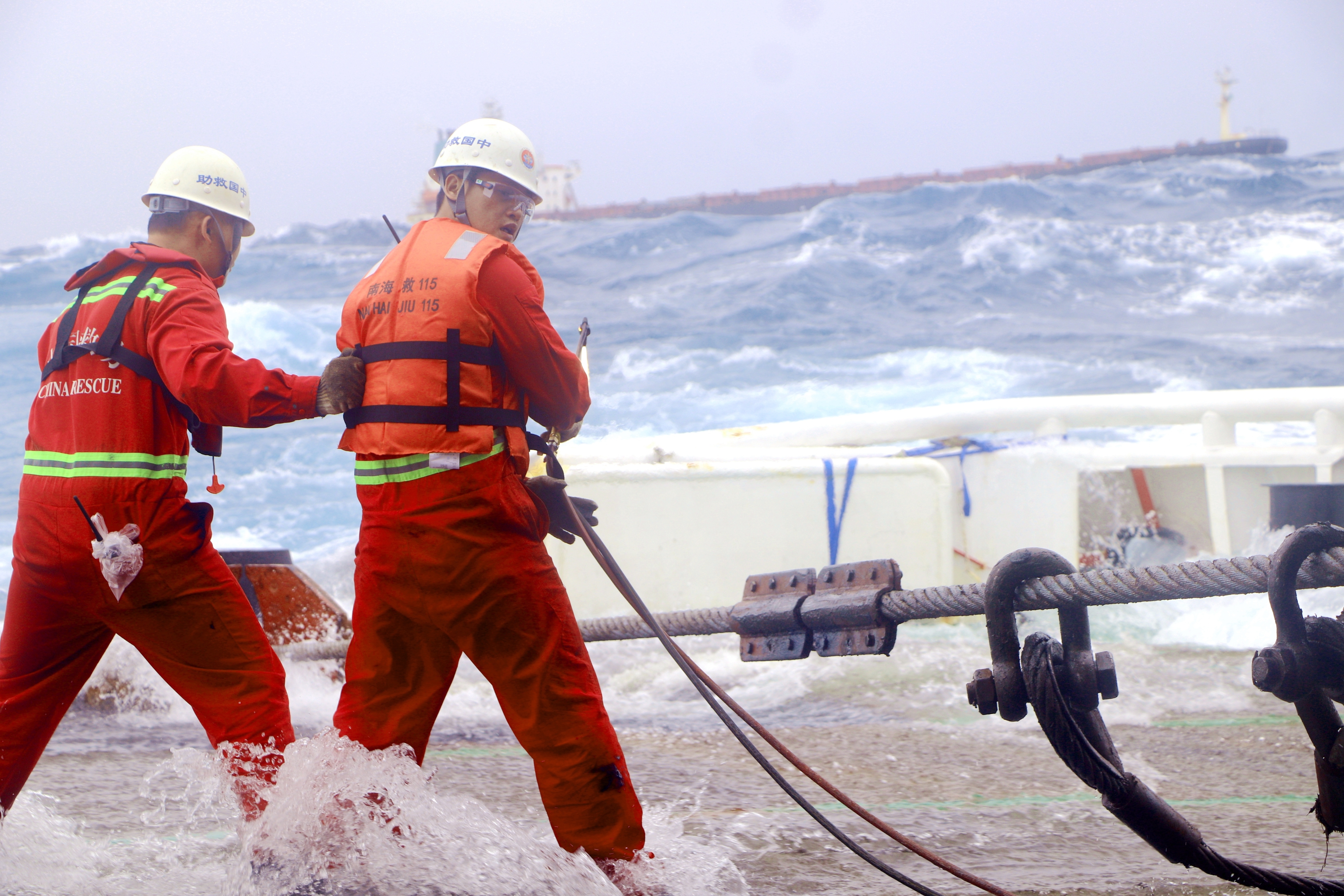 4月10日,“南海救115”輪甲板部人員正在安裝甲板安全繩,以保障極端天氣下甲板作業(yè)人員安全。新華社記者 夏天 攝