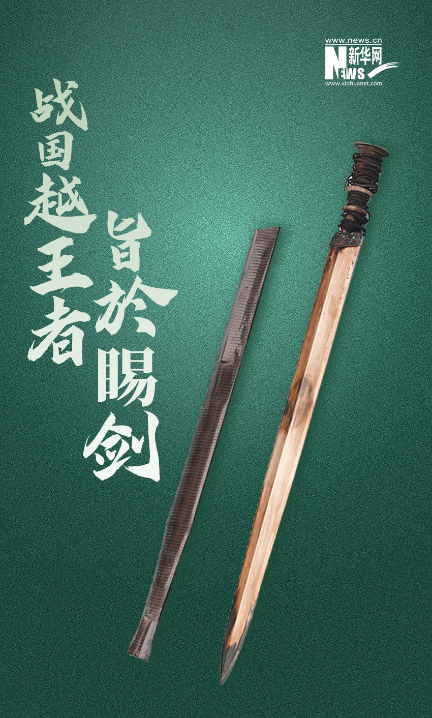 越王者旨於睗劍為銅質(zhì),劍體寬闊中脊起線,雙刃呈弧形于近鋒處收狹,圓盤形劍首,圓莖上有兩凸箍,箍飾變形獸面紋,莖繞絲質(zhì)纏緱,劍格兩面鑄雙鉤鳥蟲書銘文。正面為:戉(越)王戉(越)王;反面為:者[zhū]旨[jī]於[yú]睗[shì]劍。