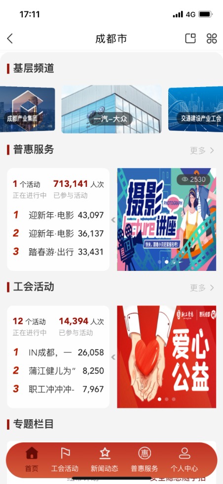 按照全總“559”工作部署要求,成都市總工會(huì)緊緊圍繞企業(yè)職工需要“什么”、產(chǎn)(企)業(yè)能得到“什么”、工會(huì)要做“什么”三個(gè)出發(fā)點(diǎn),積極探索產(chǎn)(企)業(yè)工會(huì)頻道建設(shè),打通服務(wù)職工“最后一公里”。目前已上線成都市交通建設(shè)工會(huì)、一汽大眾汽車有限公司成都分公司工會(huì)、成都軌道交通集團(tuán)有限公司工會(huì)、成都產(chǎn)業(yè)投資集團(tuán)有限公司工會(huì)4家產(chǎn)(企)業(yè)工會(huì)頻道,新建企業(yè)專屬服務(wù)場(chǎng)景6個(gè),直接覆蓋12萬(wàn)余名職工會(huì)員。