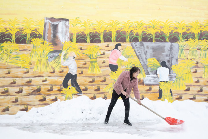 ??黑龍江省漠河市北極鎮(zhèn)北紅村“遠(yuǎn)方故里”民宿負(fù)責(zé)人張翠花在清理積雪(2023年1月12日攝)。新華社記者 張濤 攝