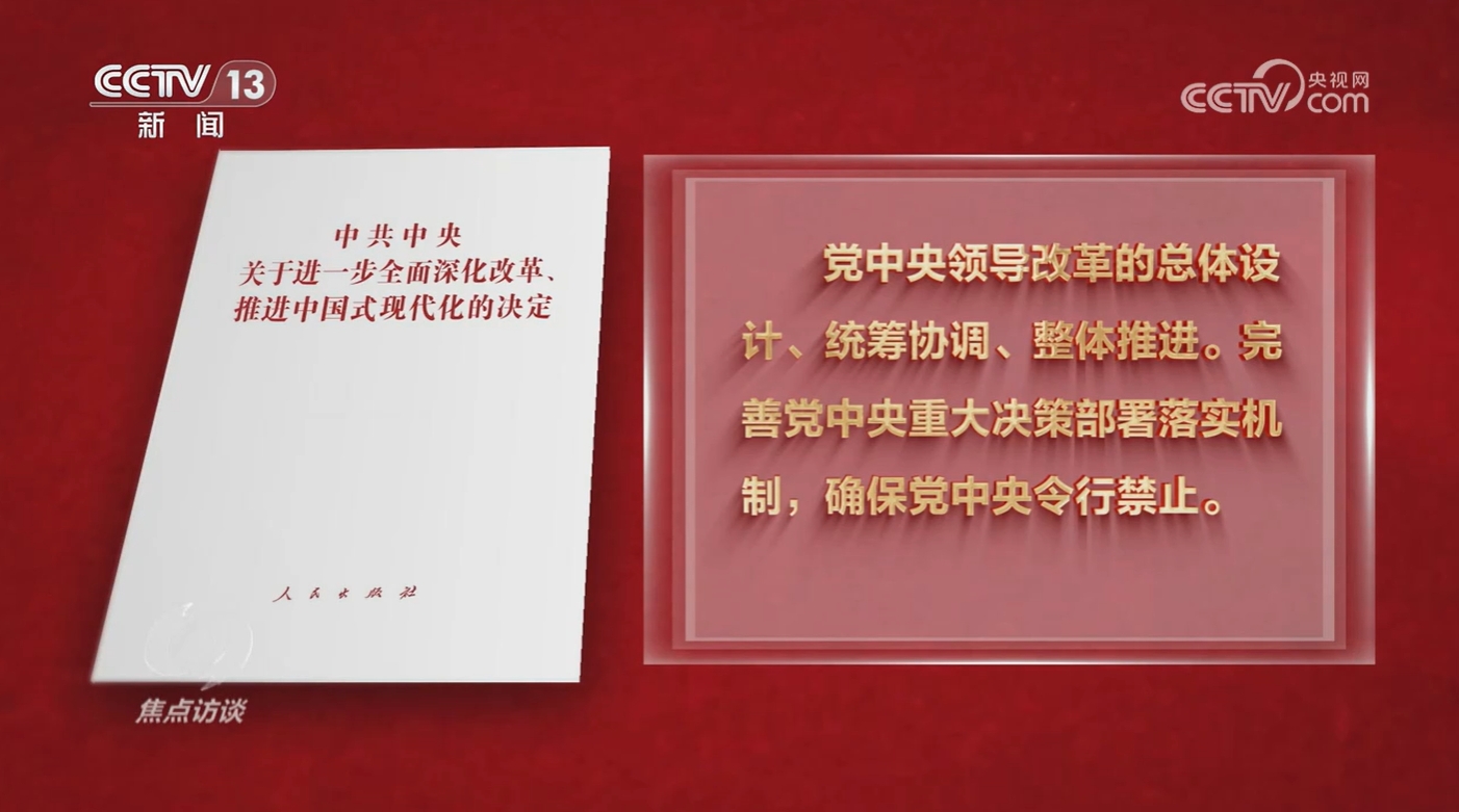 新征程上,如何提高黨對(duì)進(jìn)一步全面深化改革、推進(jìn)中國(guó)式現(xiàn)代化的領(lǐng)導(dǎo)水平?《決定》專門用一個(gè)部分來(lái)進(jìn)行部署,并從三個(gè)方面作出具體安排,第一方面的重點(diǎn)是,堅(jiān)持黨中央對(duì)進(jìn)一步全面深化改革的集中統(tǒng)一領(lǐng)導(dǎo)。