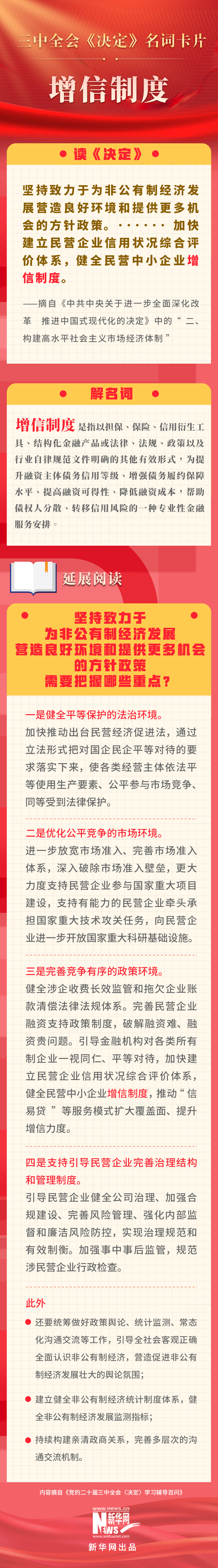 黨的二十屆三中全會審議通過了《中共中央關(guān)于進(jìn)一步全面深化改革、推進(jìn)中國式現(xiàn)代化的決定》。新華網(wǎng)依據(jù)《黨的二十屆三中全會〈決定〉學(xué)習(xí)輔導(dǎo)百問》,制作三中全會《決定》系列名詞卡片,和大家一起來深入學(xué)習(xí)領(lǐng)會二十屆三中全會精神。本期名詞是“增信制度”。