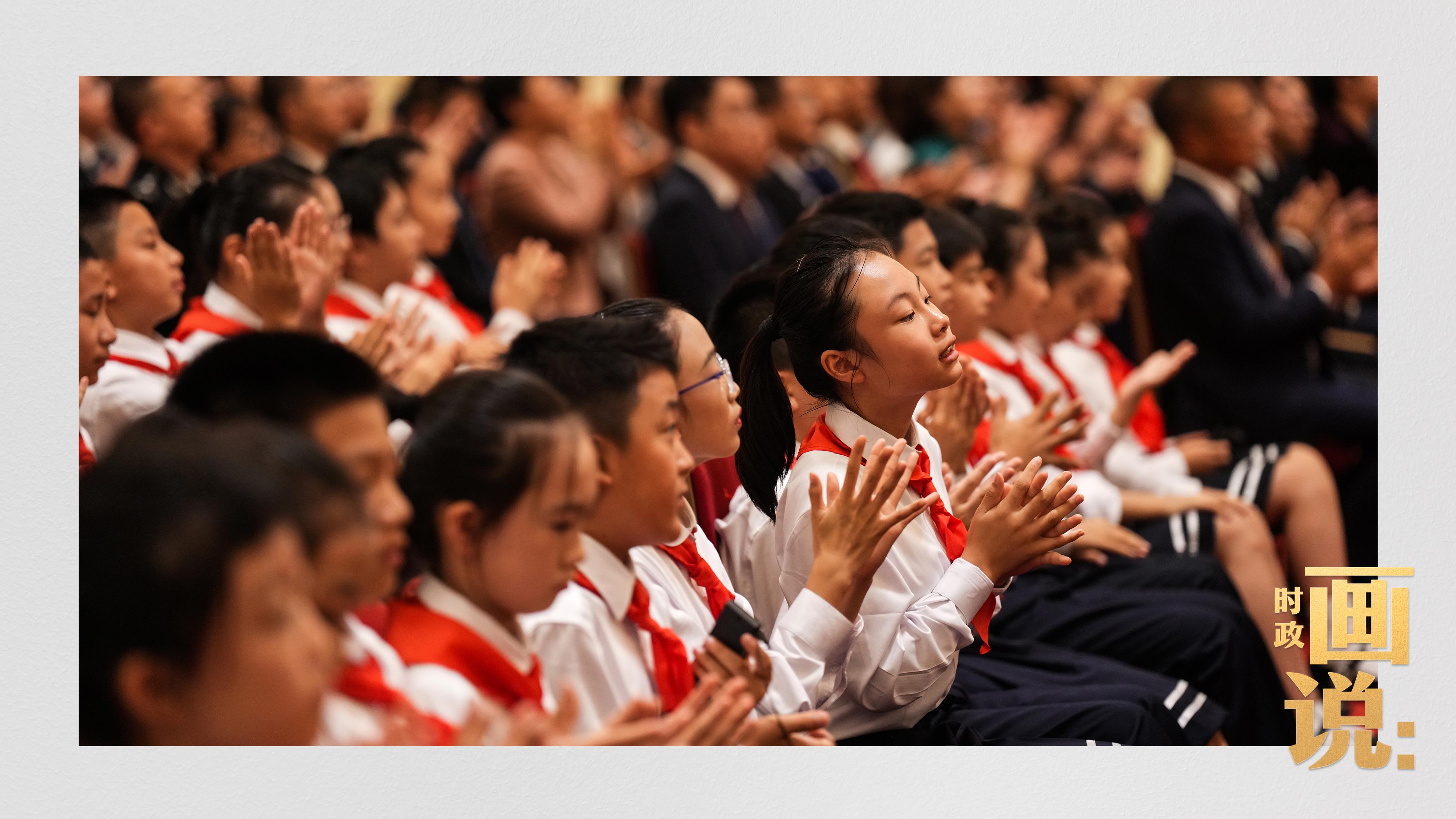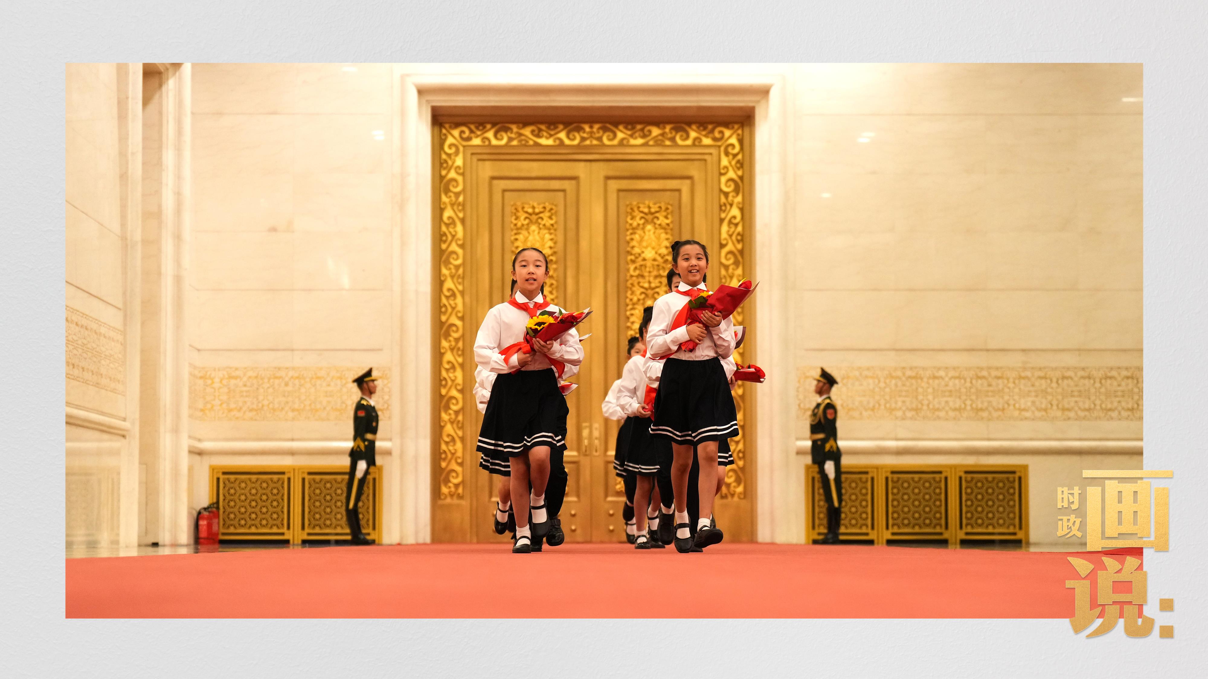 △少先隊(duì)員向國家勛章和國家榮譽(yù)稱號獲得者獻(xiàn)花。