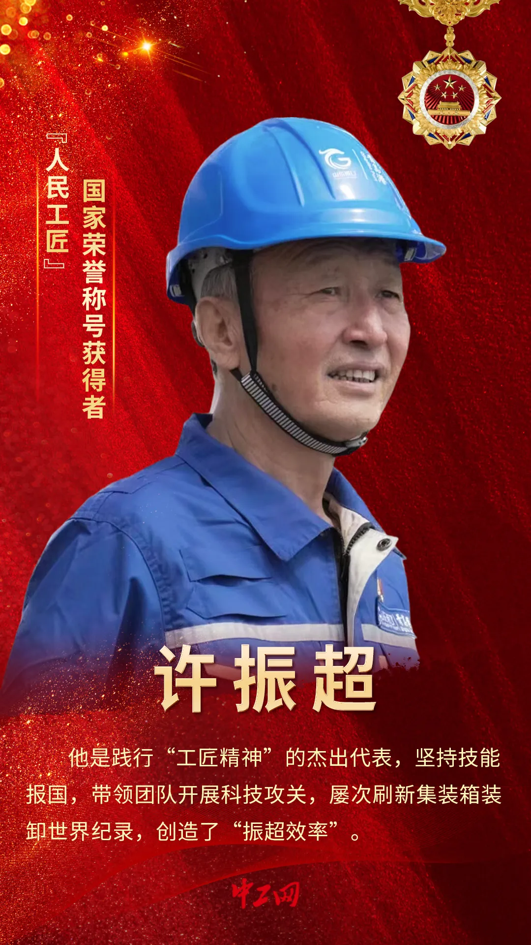 今年是中華人民共和國成立75周年,黨中央決定,開展國家勛章和國家榮譽(yù)稱號集中評選頒授,隆重表彰14名為新中國建設(shè)和發(fā)展作出杰出貢獻(xiàn)的功勛模范人物。作為一線工人,許振超被頒授“人民工匠”國家榮譽(yù)稱號獎(jiǎng)?wù)拢粌H是對他個(gè)人成績的肯定,更是對工匠精神的弘揚(yáng)和對工匠人才的鼓舞,激勵(lì)廣大產(chǎn)業(yè)工人在崗位上精益求精、追求卓越。