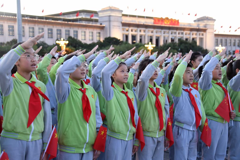 10月1日清晨,隆重的升國旗儀式在北京天安門廣場(chǎng)舉行,慶祝中華人民共和國成立75周年。這是少先隊(duì)員向國旗敬禮。新華社記者 任超 攝