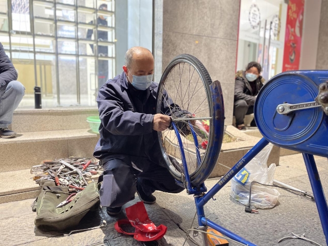 孔勝東在中山北路義務(wù)服務(wù)點(diǎn)為民修車。受訪者供圖