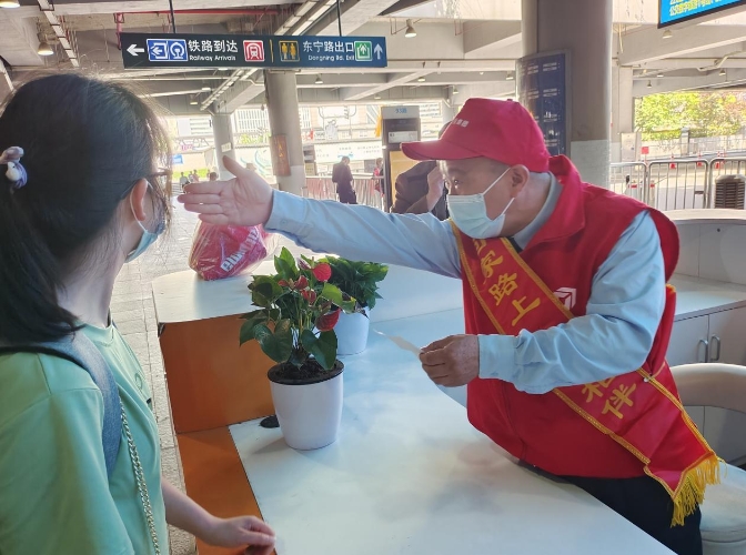 孔勝東在火車東站東廣場為乘客指路。受訪者供圖