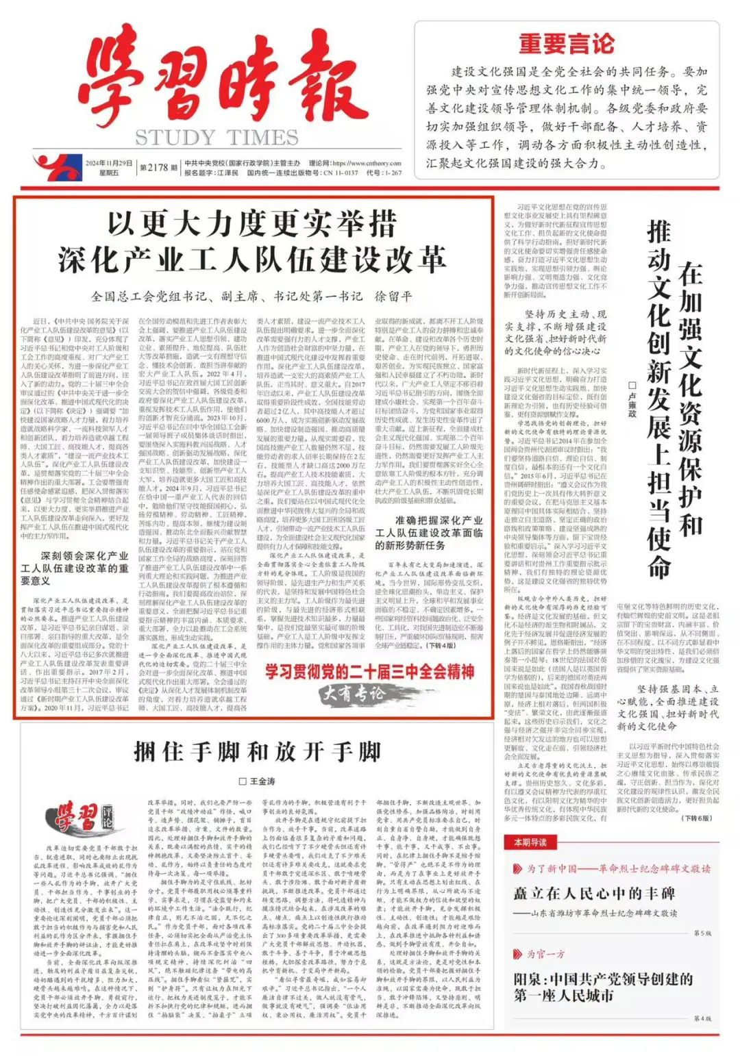 近日,《中共中央 國務院關于深化產(chǎn)業(yè)工人隊伍建設改革的意見》(以下簡稱《意見》)印發(fā),充分體現(xiàn)了習近平總書記和黨中央對工人階級和工會工作的高度重視、對廣大產(chǎn)業(yè)工人的關心關懷,為進一步深化產(chǎn)業(yè)工人隊伍建設改革指明了前進方向,注入了新的動力。黨的二十屆三中全會審議通過的《中共中央關于進一步全面深化改革、推進中國式現(xiàn)代化的決定》(以下簡稱《決定》)強調要“加快建設國家戰(zhàn)略人才力量,著力培養(yǎng)造就戰(zhàn)略科學家、一流科技領軍人才和創(chuàng)新團隊,著力培養(yǎng)造就卓越工程師、大國工匠、高技能人才,提高各類人才素質”,“建設一流產(chǎn)業(yè)技術工人隊伍”。深化產(chǎn)業(yè)工人隊伍建設改革,是貫徹落實黨的二十屆三中全會精神作出的重大部署。工會要增強責任感使命感緊迫感,把深入貫徹落實《意見》與學習貫徹全會精神結合起來,以更大力度、更實舉措推進產(chǎn)業(yè)工人隊伍建設改革走向深入,更好發(fā)揮產(chǎn)業(yè)工人隊伍在推進中國式現(xiàn)代化中的主力軍作用。