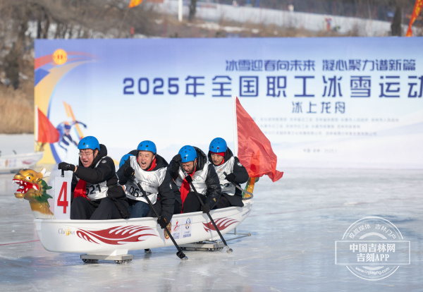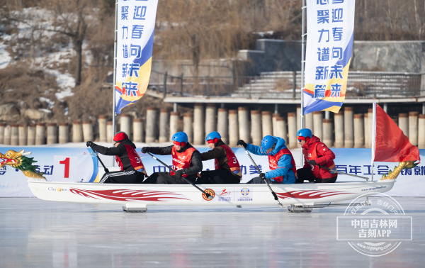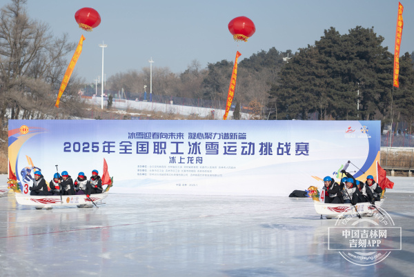 全國職工冰雪運(yùn)動挑戰(zhàn)賽同樣設(shè)有冰上龍舟比賽項(xiàng)目。1月7日,該項(xiàng)目比賽在長春市激情開賽。