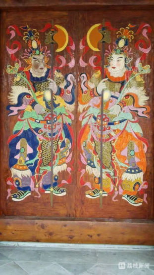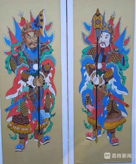 張桅:上古時期,人們會在門上畫出《山海經(jīng)》中神荼、郁壘兩位神仙及老虎的像,希望借助他們的力量來驅(qū)邪避禍。在漢代,門神形象開始從神祇向人物角色轉(zhuǎn)變,駐守閬中的張飛也被納入門神的行列,進一步推動了門神的人性化。到了唐代,秦瓊和尉遲恭兩位大將勇猛善戰(zhàn),他們被繪制成門神的形象以驅(qū)邪避鬼,門神的形象更加多樣化,鐘馗、岳飛、關(guān)羽等武將形象也成為了門神。