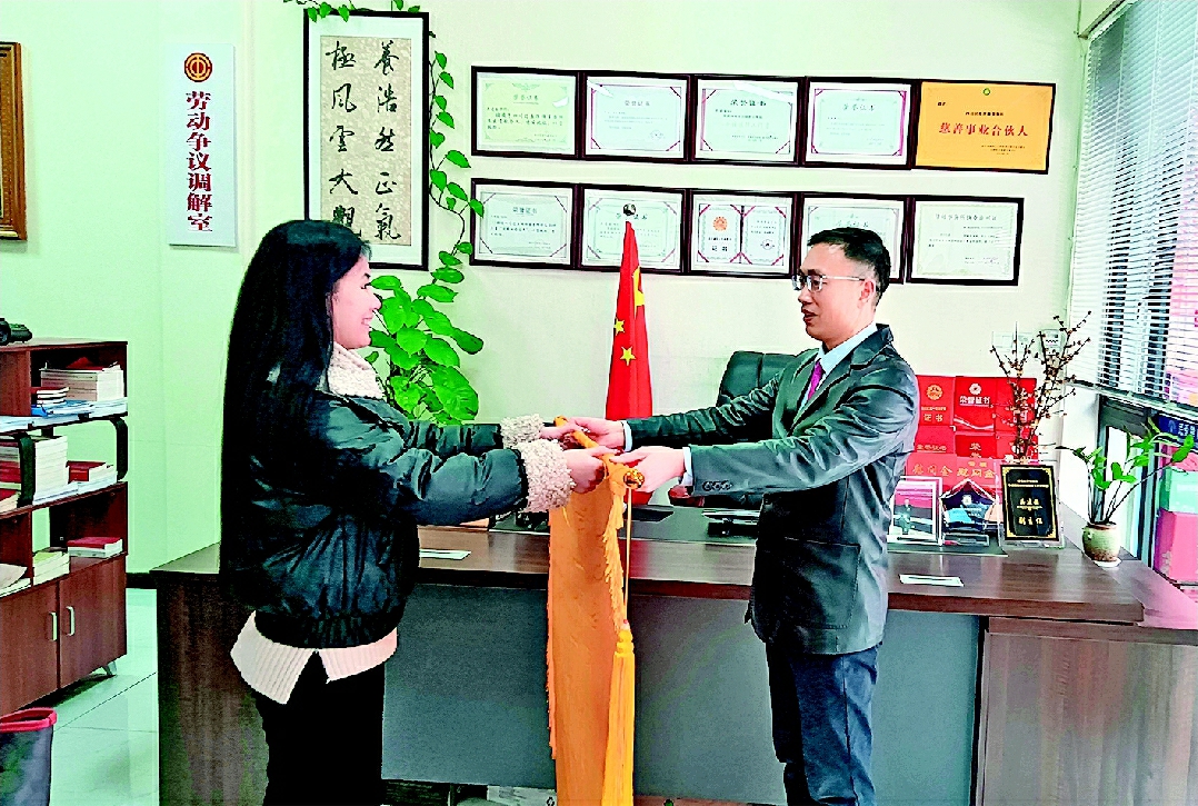 2月6日,四川民愛律師事務(wù)所內(nèi),工亡農(nóng)民工袁某某之女袁麗(化名,系死者唯一繼承人)在拿到164萬(wàn)余元賠償款后,將一面錦旗送到了工會(huì)律師吳建國(guó)手中,激動(dòng)地表示感謝工會(huì)和律師作為農(nóng)民工的堅(jiān)強(qiáng)后盾,全程協(xié)助她拿回了屬于自己父親的工亡賠償。
