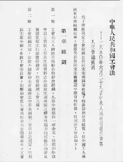為適應建設統(tǒng)一的全國工會組織的要求,1950年初,在李立三同志的主持下,全國總工會和勞動部組織力量開始《工會法》的起草工作。同年4月21日,政務院政務會議通過了《工會法(草案)》,并廣泛征詢各級人民政府和所屬部門,特別是經(jīng)濟部門和工廠企業(yè)管理機關以及各地工會組織和工商業(yè)者的意見。6月28日,中央人民政府委員會第八次會議通過;6月29日,毛澤東主席簽署發(fā)布中央人民政府令,頒布實施《工會法》。