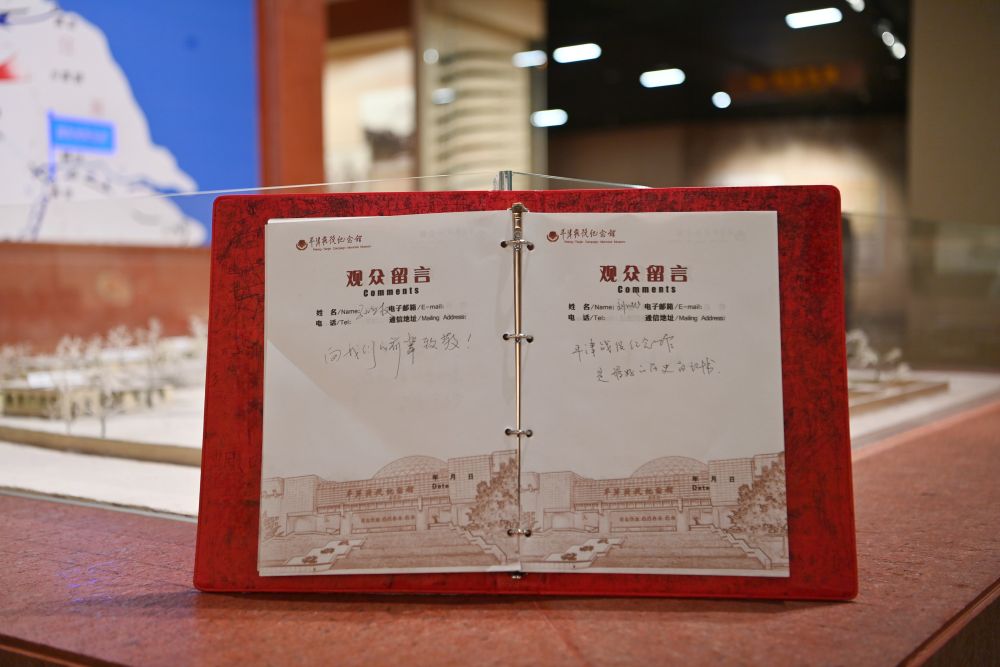 這是2025年3月27日拍攝的平津戰(zhàn)役紀(jì)念館觀眾留言簿。一名觀眾寫下“向我們的前輩致敬!”