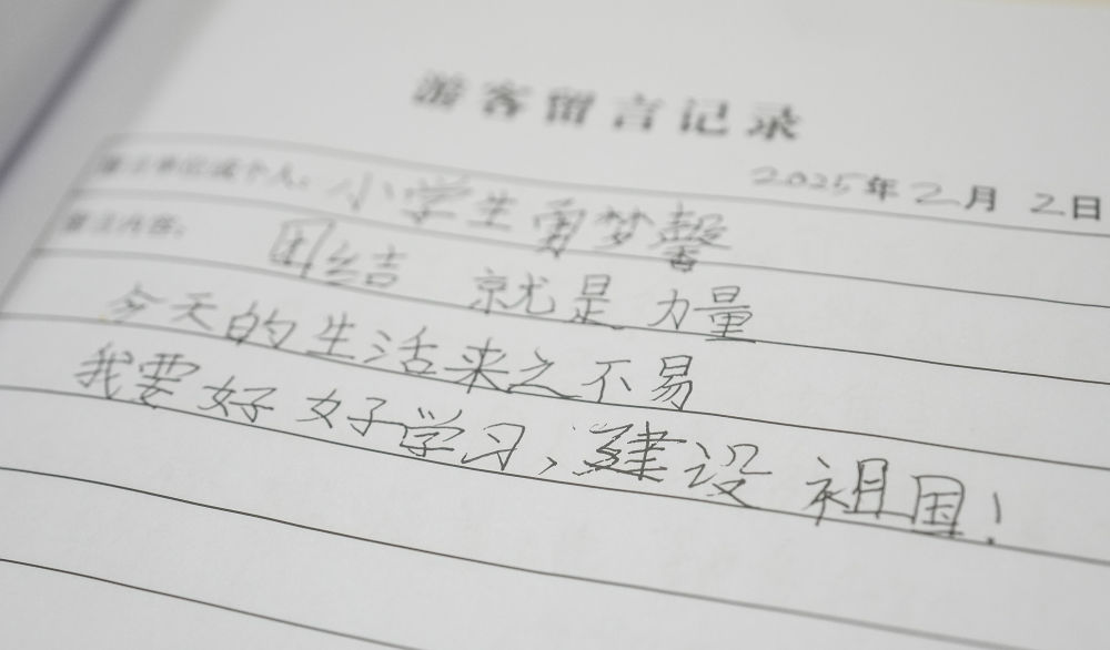 2025年4月1日,錦州市一名小學(xué)生在參觀遼寧省錦州市遼沈戰(zhàn)役紀(jì)念館后,在留言簿上留下感想。