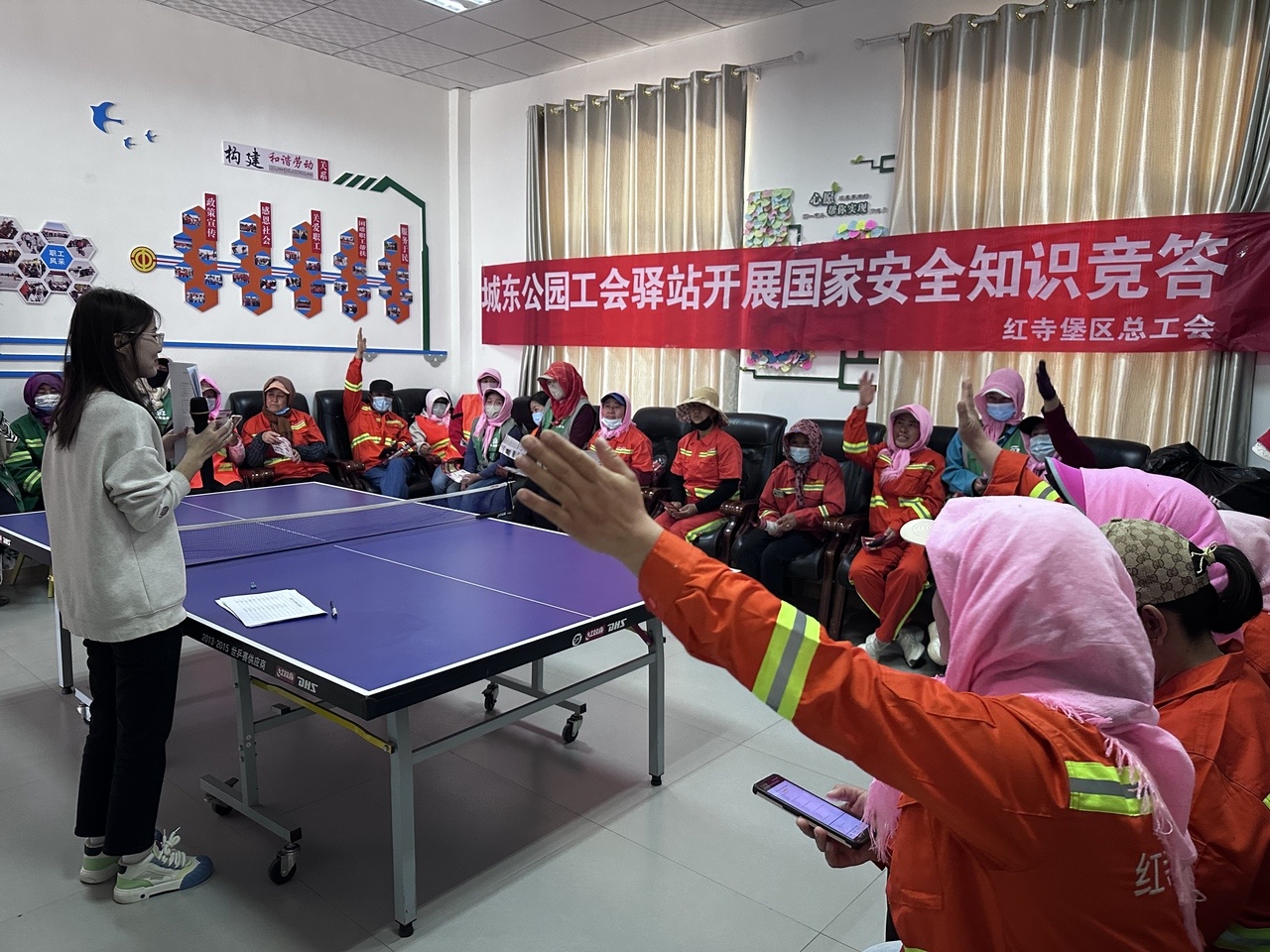 4月14日下午,寧夏回族自治區(qū)吳忠市紅寺堡區(qū)總工會在城東公園工會驛站開展國家安全知識競答活動,吸引環(huán)衛(wèi)工人、林業(yè)工人等50余名戶外勞動者積極參與。