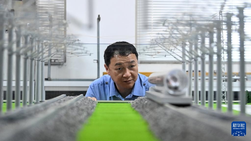 彭春林在工作室對接觸網(wǎng)作業(yè)車防傾覆裝置的元件進(jìn)行測量(4月22日攝)。新華社記者 張愛林 攝