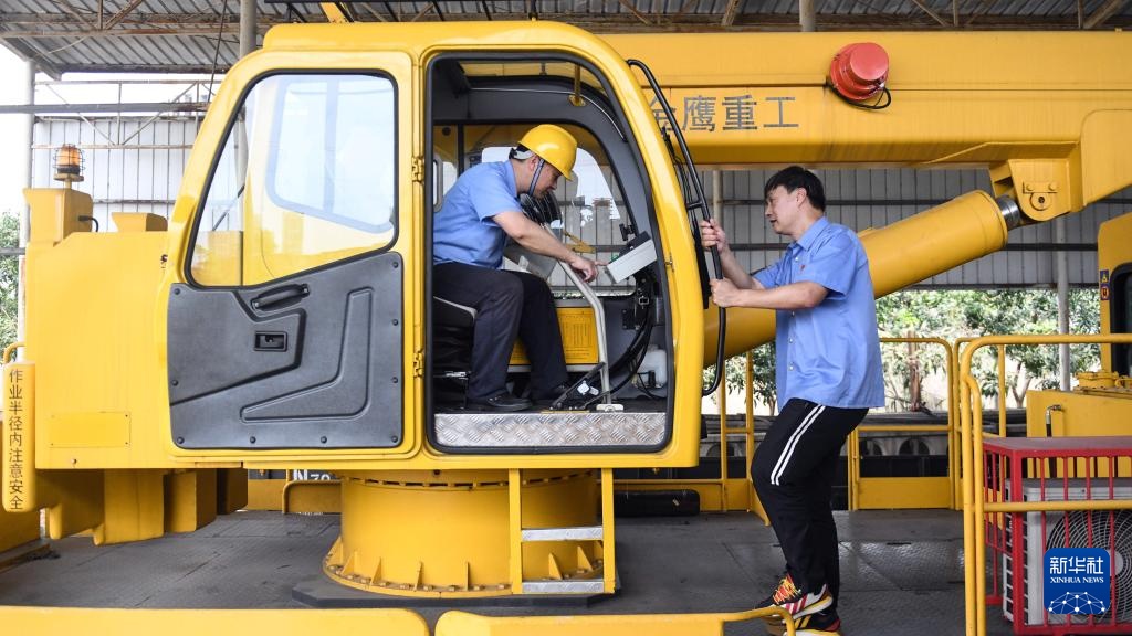 彭春林(左)在柳州動力設(shè)備車間檢查接觸網(wǎng)作業(yè)車防傾覆裝置使用情況(4月25日攝)。新華社記者 張愛林 攝