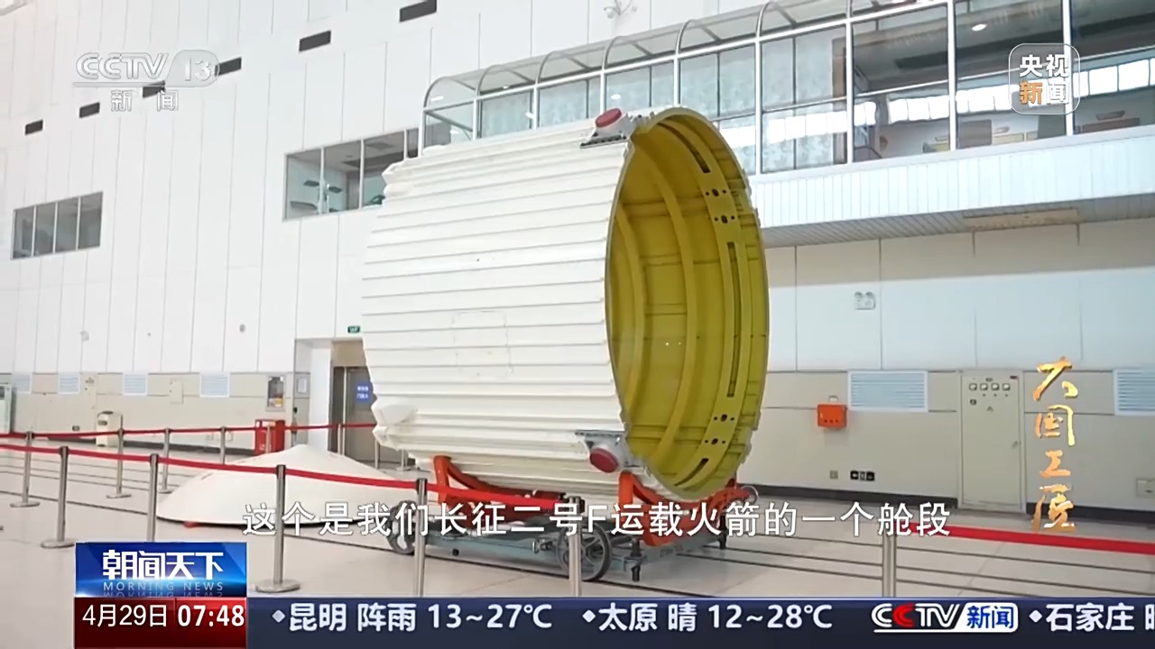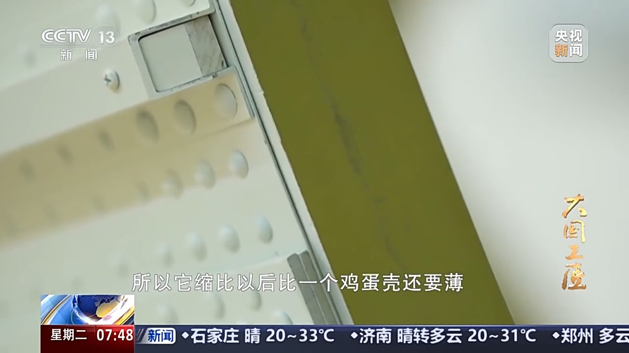 中國航天科技集團(tuán)一院主任工藝師 劉爭:這個是我們長征二號F運載火箭的一個艙段,我們的火箭為了提高它的運載能力,都采用這種薄壁的設(shè)計結(jié)構(gòu),它的直徑有3米35,但是壁厚只有1毫米左右,所以它縮比以后比一個雞蛋殼還要薄。