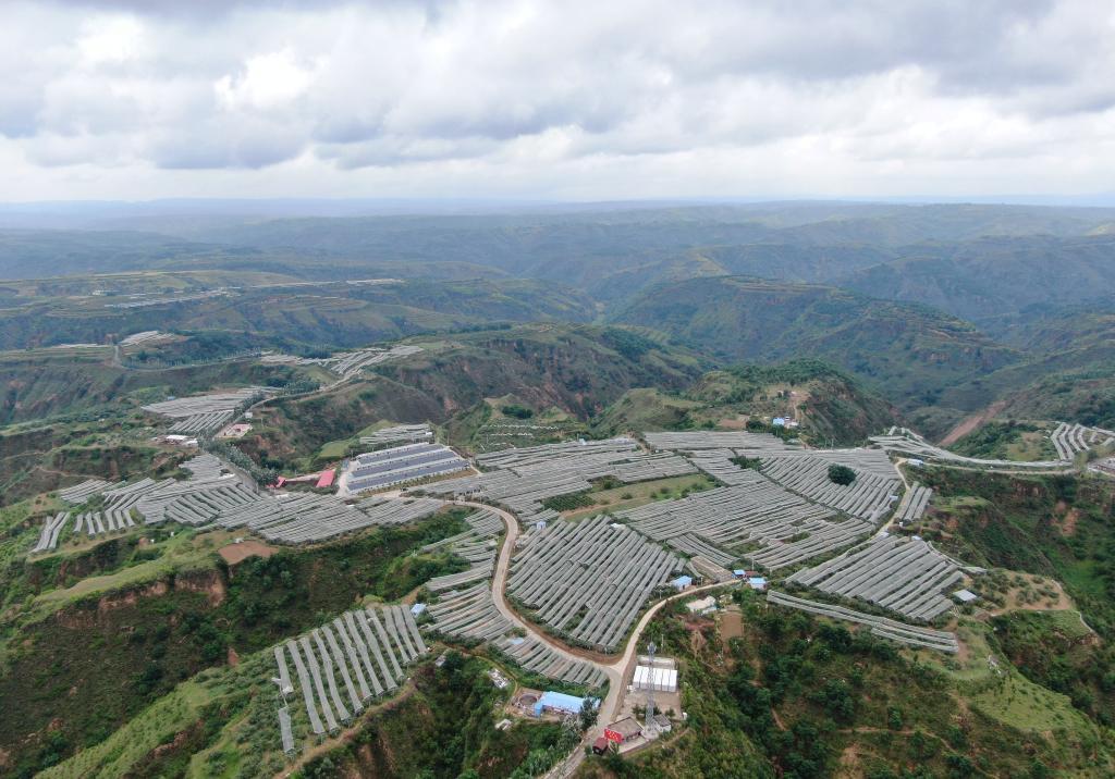 陜西省延安市延川縣文安驛鎮(zhèn)梁家河村山地蘋(píng)果園(無(wú)人機(jī)照片,2023年6月28日攝)。新華社記者 張博文 攝