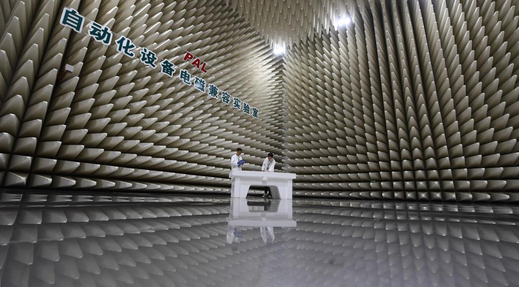 在南瑞集團(tuán)有限公司自動(dòng)化設(shè)備電磁兼容實(shí)驗(yàn)室,科研人員進(jìn)行輻射發(fā)射實(shí)驗(yàn)準(zhǔn)備工作(2023年7月7日攝)。新華社記者 季春鵬 攝