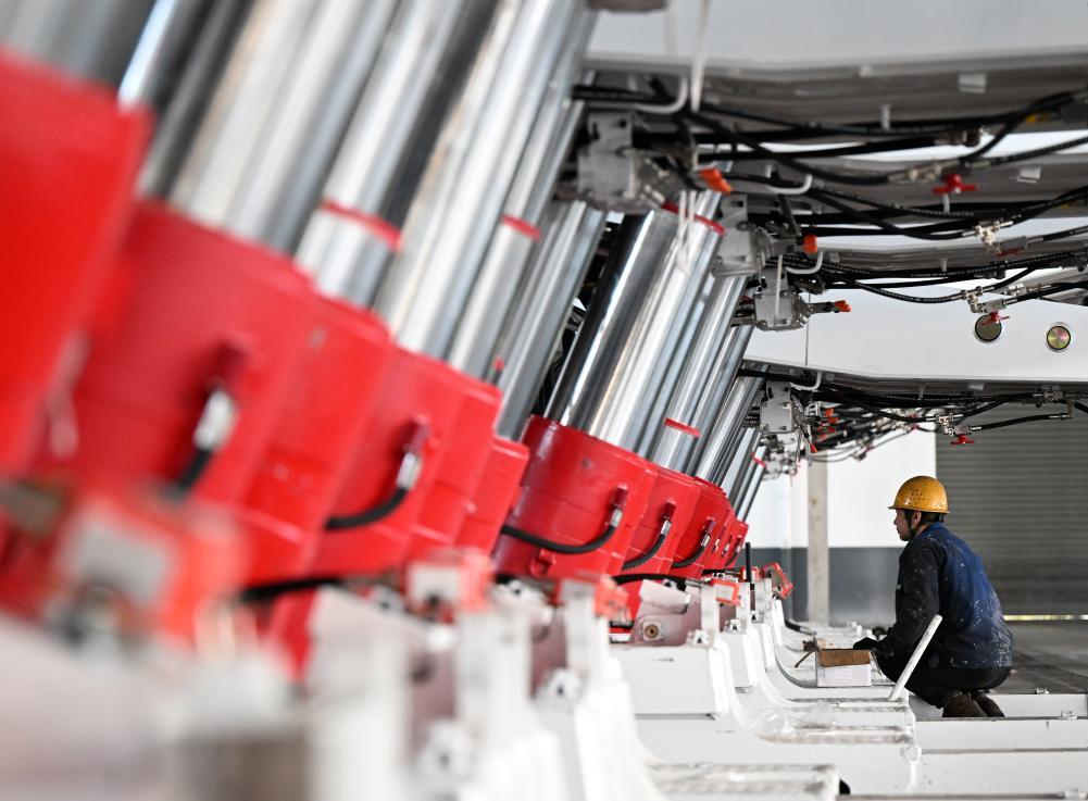工人在林州重機(jī)集團(tuán)股份有限公司液壓支架總裝車(chē)間進(jìn)行安裝調(diào)試作業(yè)(2025年3月19日攝)。新華社記者 李嘉南 攝