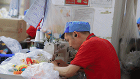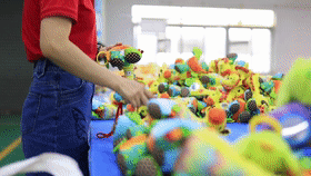 車間另一頭,品檢組組長梁建敏正給玩具成品審核把關(guān)。梁建敏很瘦,但很有能量,拖貨、倒貨、檢查貨,好像總有使不完的力氣,臉上總是掛著陽光般的笑容,眼睛里充滿對工作的熱忱。她驗(yàn)貨時不單用眼睛,還會把毛絨玩具貼近耳朵來聽。