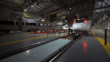 動車進(jìn)入檢修庫內(nèi),工作人員正根據(jù)任務(wù)計(jì)劃進(jìn)行動車組一級修作業(yè)。