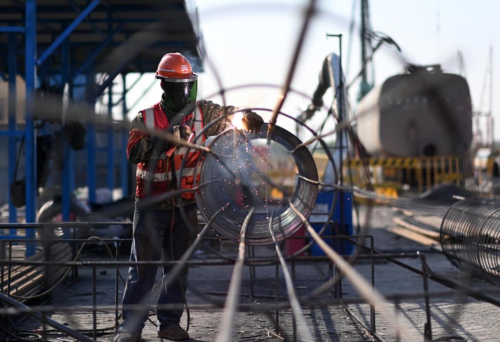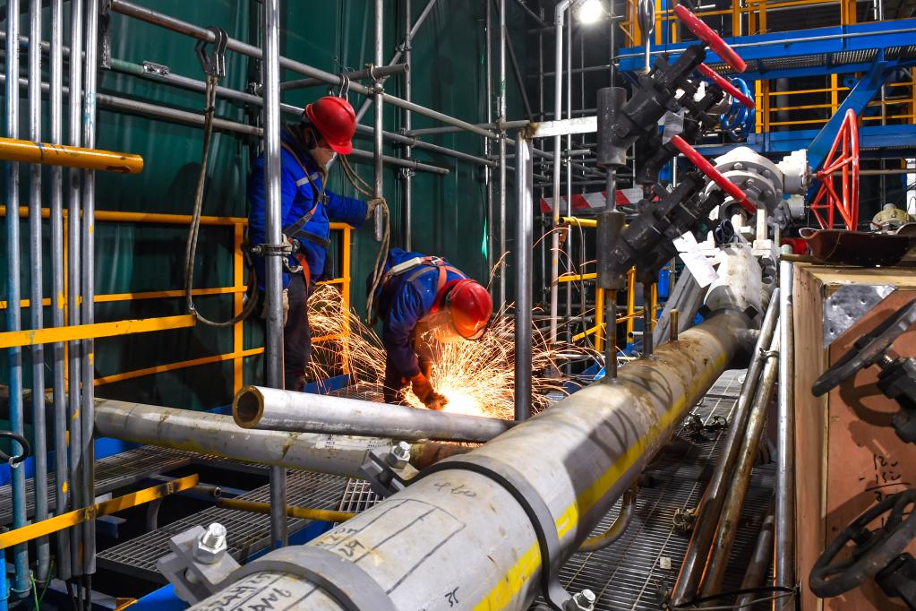 2月12日,工人在位于吉林省吉林市的中國石油吉林石化公司煉油化工轉(zhuǎn)型升級項(xiàng)目120萬噸/年乙烯裝置建設(shè)現(xiàn)場施工作業(yè)。新華社記者 許暢 攝
