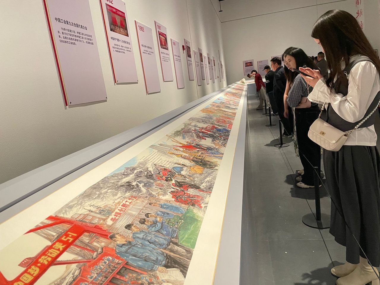 展覽以《中國工運史百米畫卷》為核心亮點。這幅由寧夏畫家團隊歷時一年精心創(chuàng)作的百米長卷,以《中共中央關(guān)于黨的百年奮斗重大成就和歷史經(jīng)驗的決議》為指引,構(gòu)建四個歷史時期藝術(shù)框架,采用工筆與寫意相結(jié)合的方式,生動再現(xiàn)了百年工運的輝煌歷程。畫卷中1000多個人物栩栩如生,其中100余處場景集中展現(xiàn)了工人階級在不同歷史時期的勞動風采,充分彰顯了勞模精神、勞動精神和工匠精神。