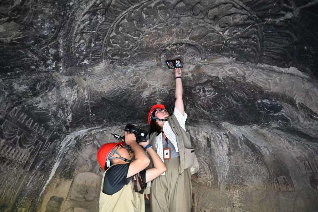 4月10日,龍門石窟研究院工作人員(右)與武漢大學(xué)文化遺產(chǎn)智能計算實驗室團(tuán)隊成員一同對龍門石窟魏字洞進(jìn)行高清攝影掃描。新華社記者 李嘉南 攝