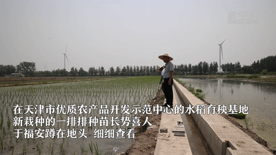 在天津市優(yōu)質(zhì)農(nóng)產(chǎn)品開發(fā)示范中心的水稻育秧基地,新栽種的一排排種苗長勢喜人。于福安蹲在地頭,細(xì)細(xì)查看。
