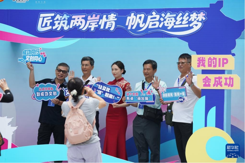 6月15日,參會人員在“匠筑兩岸情 帆啟海絲夢”的展板前合影。新華社發(fā)(王鑫攝)