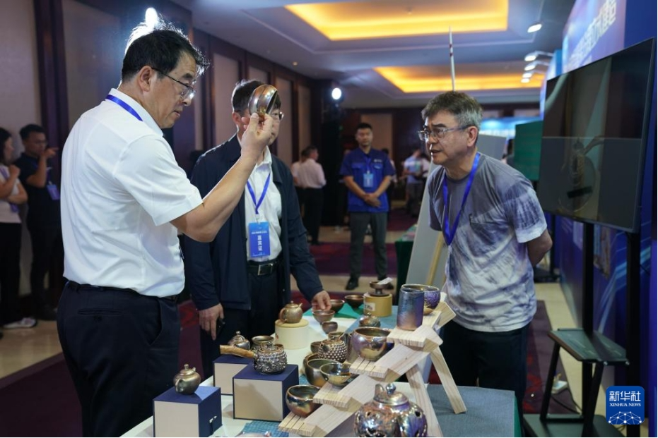 6月15日,在2025海峽職工論壇傳統(tǒng)工藝非遺產(chǎn)品展示區(qū)的柴燒窯(臺灣)展位,參會人員與柴燒陶藝傳承人吳重毅老師(右一)交流。新華社發(fā)(王鑫攝)