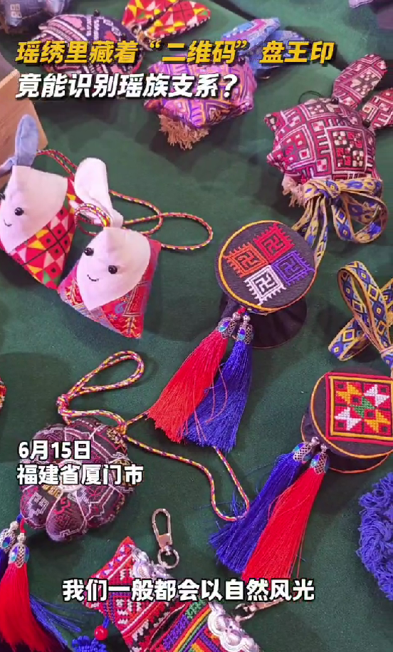 李素芳說:“瑤繡中的盤王印是瑤族一個比較重要的圖騰,相當于現(xiàn)在我們所說的‘二維碼’??吹缴砩洗┐鞯谋P王印圖案,就可以知道是瑤族的哪個支系。而服裝上的工藝,主要是瑤族的挑花刺繡技藝,是源于瑤族婦女世代傳承的手工技藝,以山川花鳥或瑤族的神話傳說作為圖案,表達了對生活的熱愛和對自然的敬畏之情。”