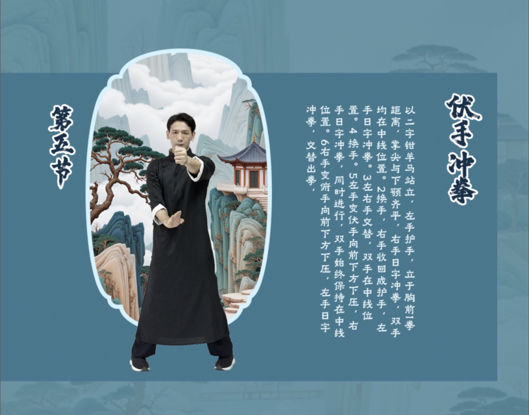 “伏手沖拳”作為詠春拳的重要手法之一,連消帶打,攻守同期的簡單組合招式。一心兩用,對身體協(xié)調(diào)鍛煉有很好的作用。