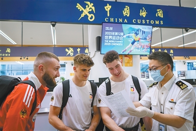 8月5日,成都海關關員引導世運會涉賽人員入境通關。人民日報記者 王明峰攝