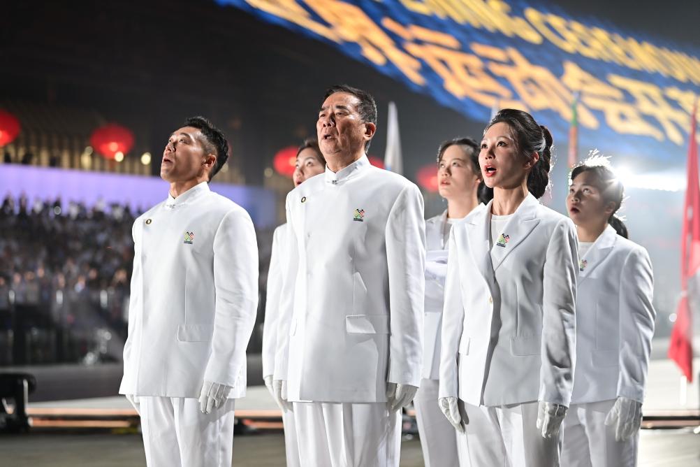 8月7日,孫志安(左三)、劉清漪(右一)和其他國(guó)際世界運(yùn)動(dòng)會(huì)協(xié)會(huì)會(huì)旗執(zhí)旗手在開(kāi)幕式上唱國(guó)歌。新華社記者 江漢 攝