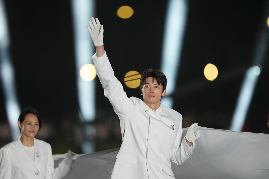 8月7日,國(guó)際奧林匹克委員會(huì)會(huì)旗執(zhí)旗手潘展樂(lè)在開(kāi)幕式上。新華社記者 劉坤 攝