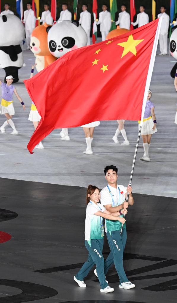 8月7日,成都世運(yùn)會(huì)組委會(huì)會(huì)旗執(zhí)旗手張雨霏在開(kāi)幕式上。新華社記者 劉坤 攝