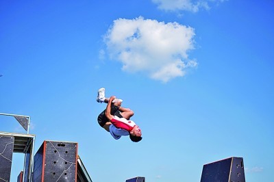 8月12日,中國(guó)選手富思達(dá)在跑酷項(xiàng)目男子自由式比賽中后空翻、握桿空翻。光明日?qǐng)?bào)記者 陳城攝/光明圖片