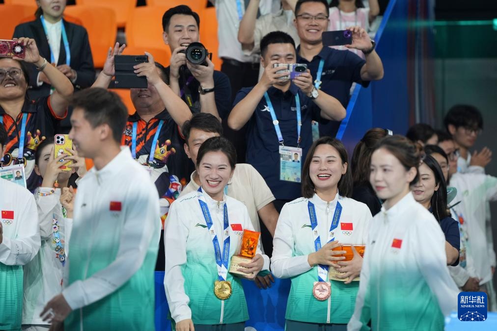 8月14日,中國選手韓雨(右三)和劉莎莎(右二)在場邊為張?zhí)┧嚕ㄇ白螅?、唐春曉(前右)慶祝。新華社記者 胥冰潔 攝