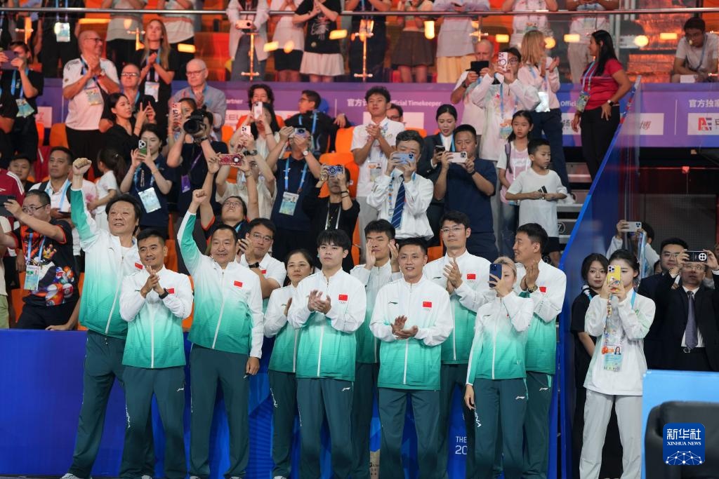 8月14日,參加成都世運會的中國臺球隊在頒獎儀式上慶祝。新華社記者 胥冰潔 攝