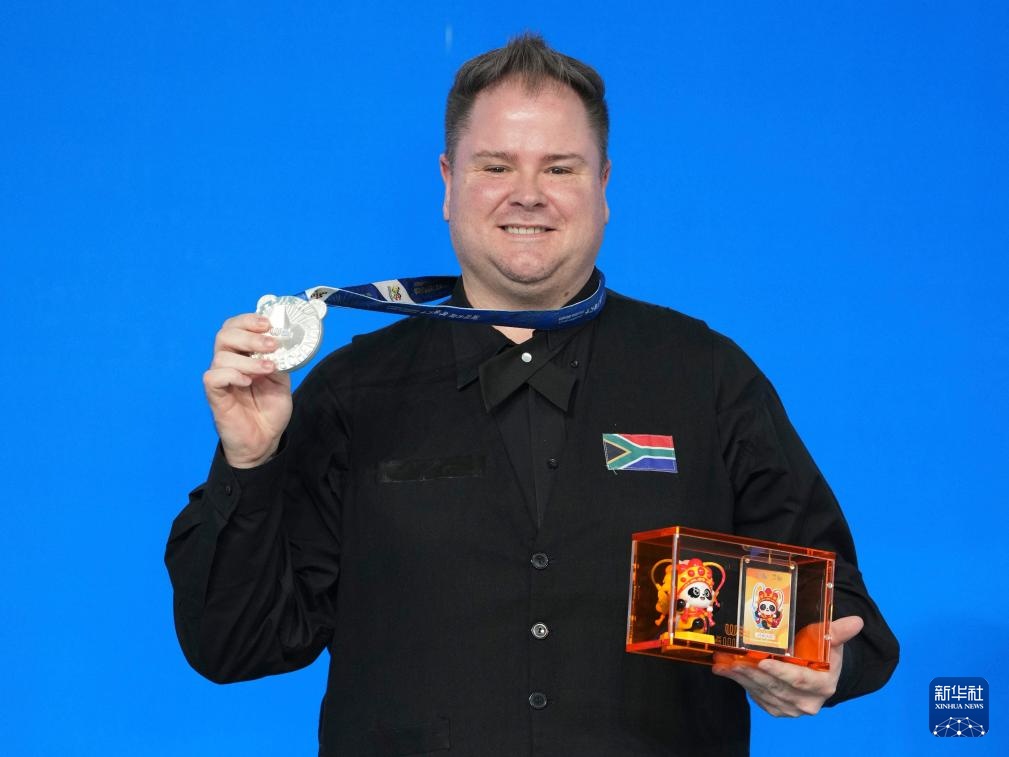 8月14日,臺球八球混合亞軍南非選手塞龍在頒獎儀式上。新華社記者 胥冰潔 攝