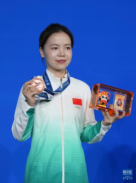 8月14日,臺球八球混合季軍中國選手唐春曉在頒獎儀式上。新華社記者 胥冰潔 攝