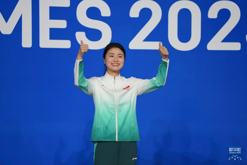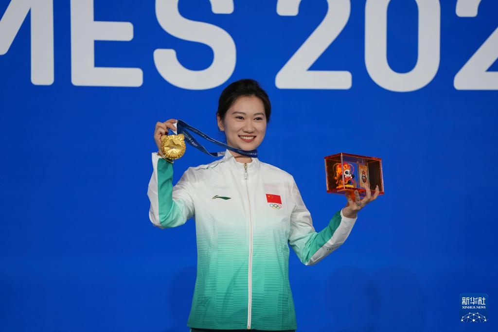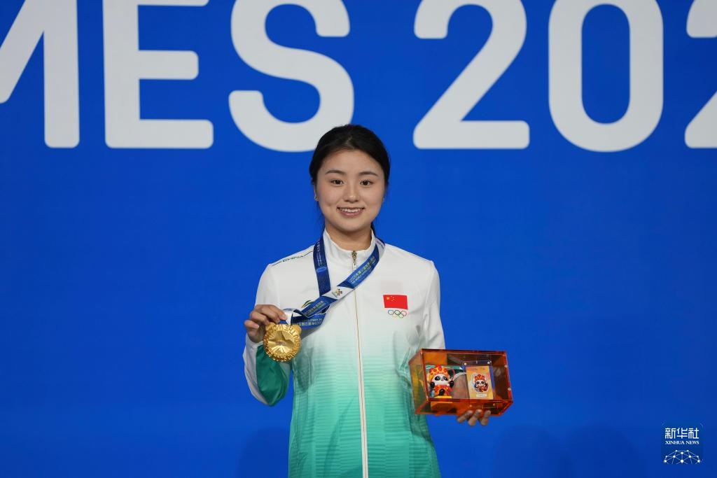 8月14日,臺球八球混合冠軍中國選手張?zhí)┧囋陬C獎儀式上。新華社記者 胥冰潔 攝