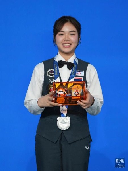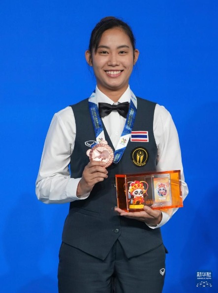 8月14日,臺球女子斯諾克6紅球季軍泰國選手博雷沖布在頒獎儀式上。新華社記者 胥冰潔 攝