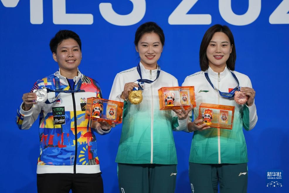 8月14日,女子花式臺球冠軍中國選手韓雨(中)、亞軍菲律賓選手森特諾(左)和季軍中國選手劉莎莎在頒獎儀式上合影。新華社記者 胥冰潔 攝